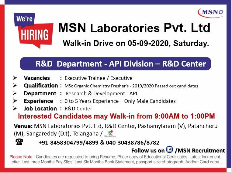 Walk-in Drive | MSN Laboratories Pvt Limited | API Division | R&D & AR&D | M.Sc | Location - Sangareddy Telangana | 04- 05 Aug 20